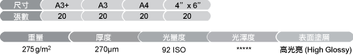 最佳打印: 生活相片/風景相片重量: 275g/m2厚度: 270μm光量度: 92表面: 高光亮